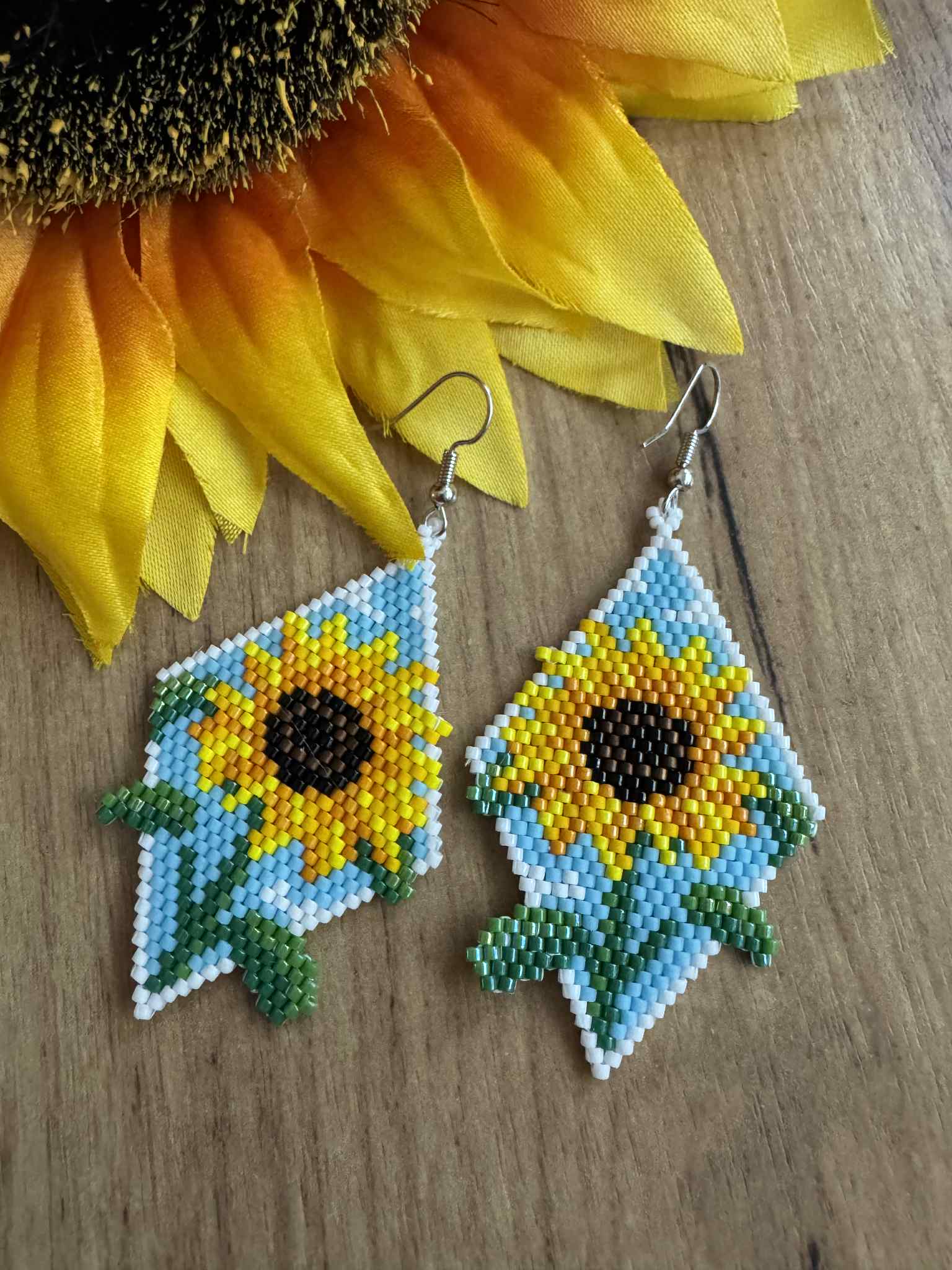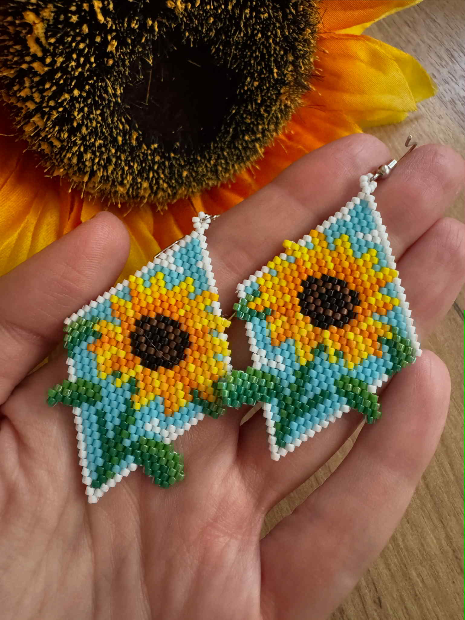 Raw technikával fűzött gyöngy fülbevaló. A fülbevaló hossza akasztóval: 8 cm. Csak a fűzött rész hossza: 6 cm A fülbevaló legszélesebb pontja: 3,8 cm.