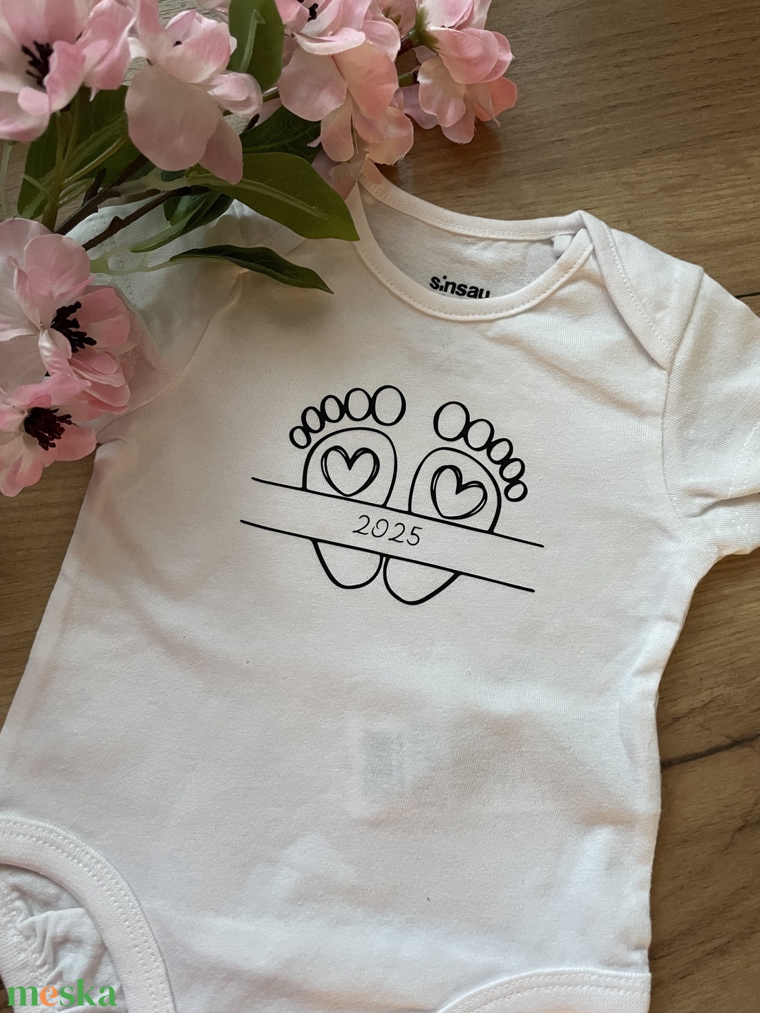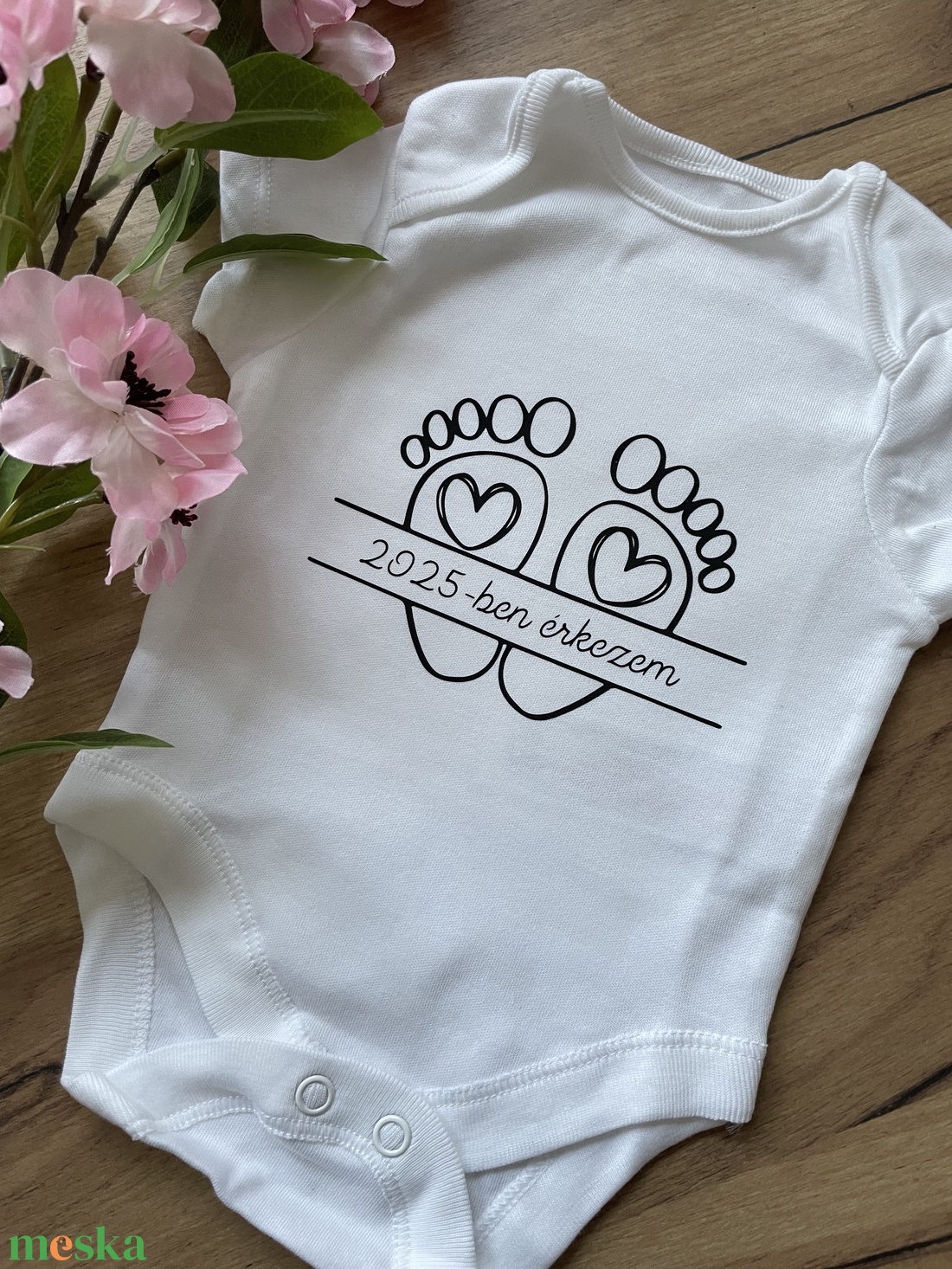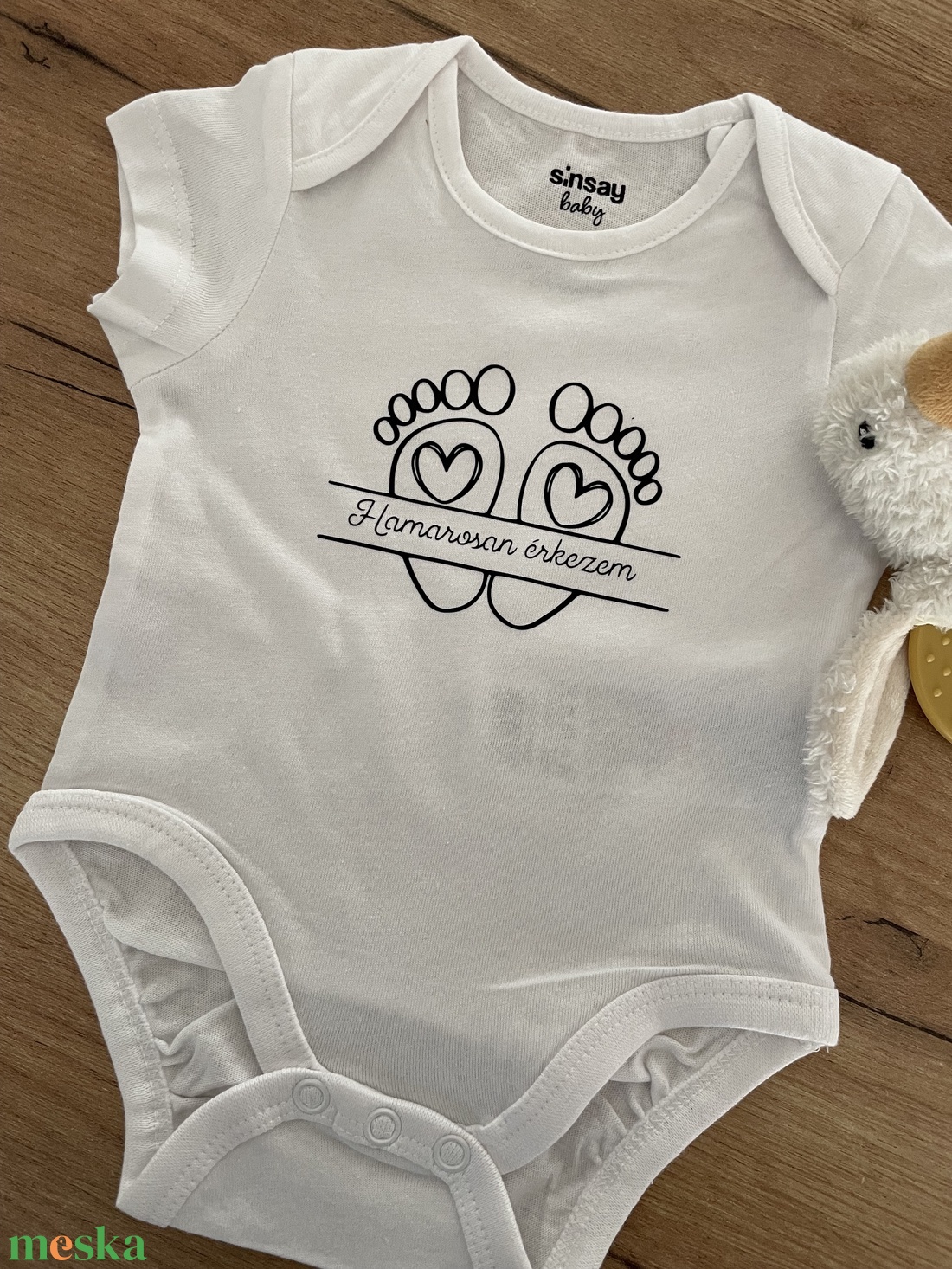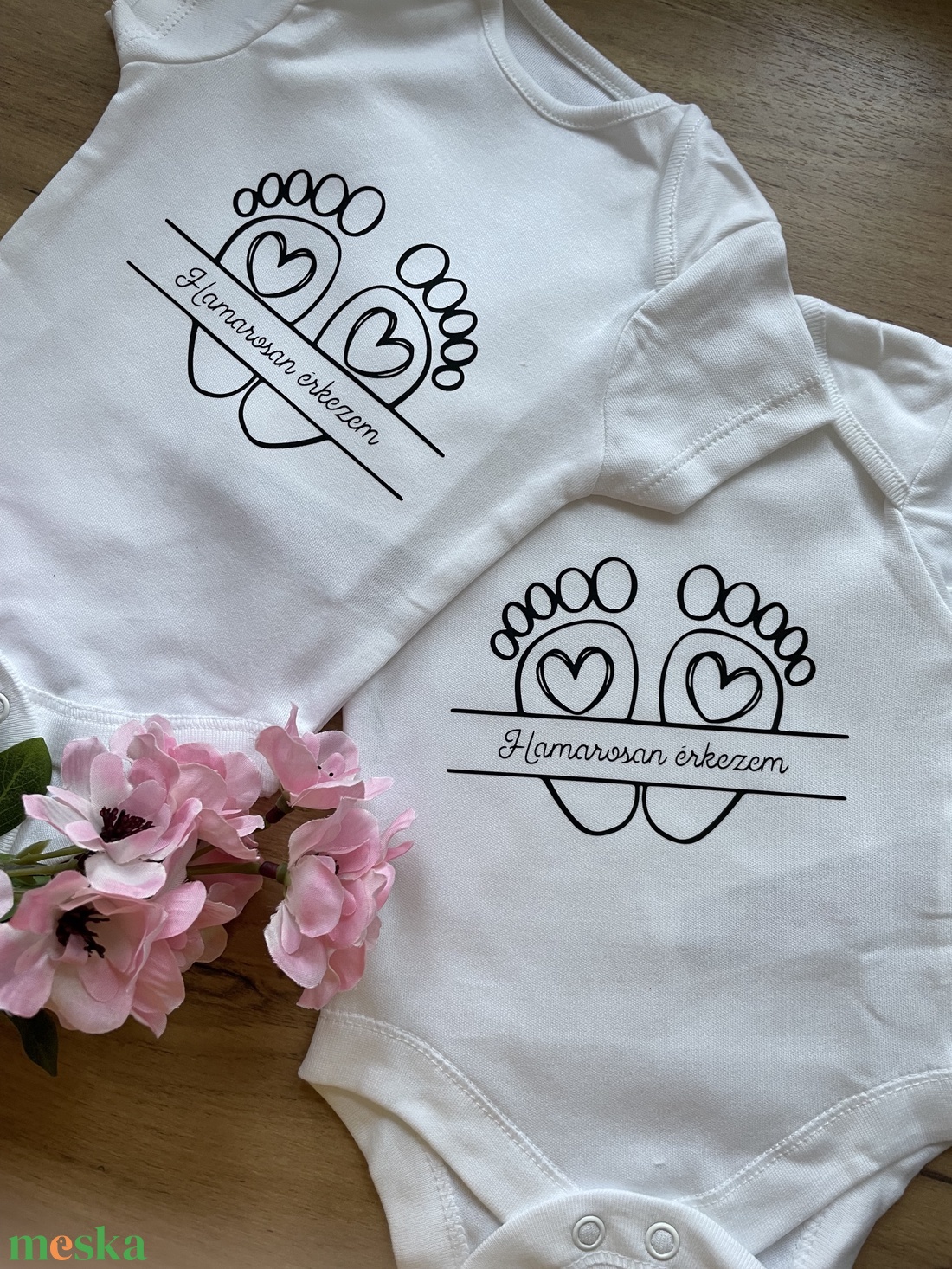 Fehér, rövid ujjú vagy ujjatlan baba body különböző méretben. A body anyaga: 100% pamut Márka: H&M, Sinsay, Primark - a különböző márkák között kisebb méretbeli különbségek lehetnek (a márka nem választható, ami éppen készleten van). A minta FIX (baba talpak) nem változtatható, de a body-n szereplő felírat szabadon választható. FONTOS, hogy karakterszámban sokkal hosszabb szöveg (mint a képen is látható "Hamarosan érkezem") nem fér ki, ezt kérlek a vásárláskor vedd figyelembe!!! Kedves ajándék lehet a baba érkezésének bejelentésekor, vagy kreatív kiegészítője lehet egy kismama fotózásnak is! Mosógépben 30 fokon mosható, szárítógépbe tenni nem ajánlott! A mintát vasalni TILOS! Vásárlás után egyeztetni szükséges a Ez az e-mail-cím a szpemrobotok elleni védelem alatt áll. Megtekintéséhez engedélyeznie kell a JavaScript használatát. e-mail címen!
