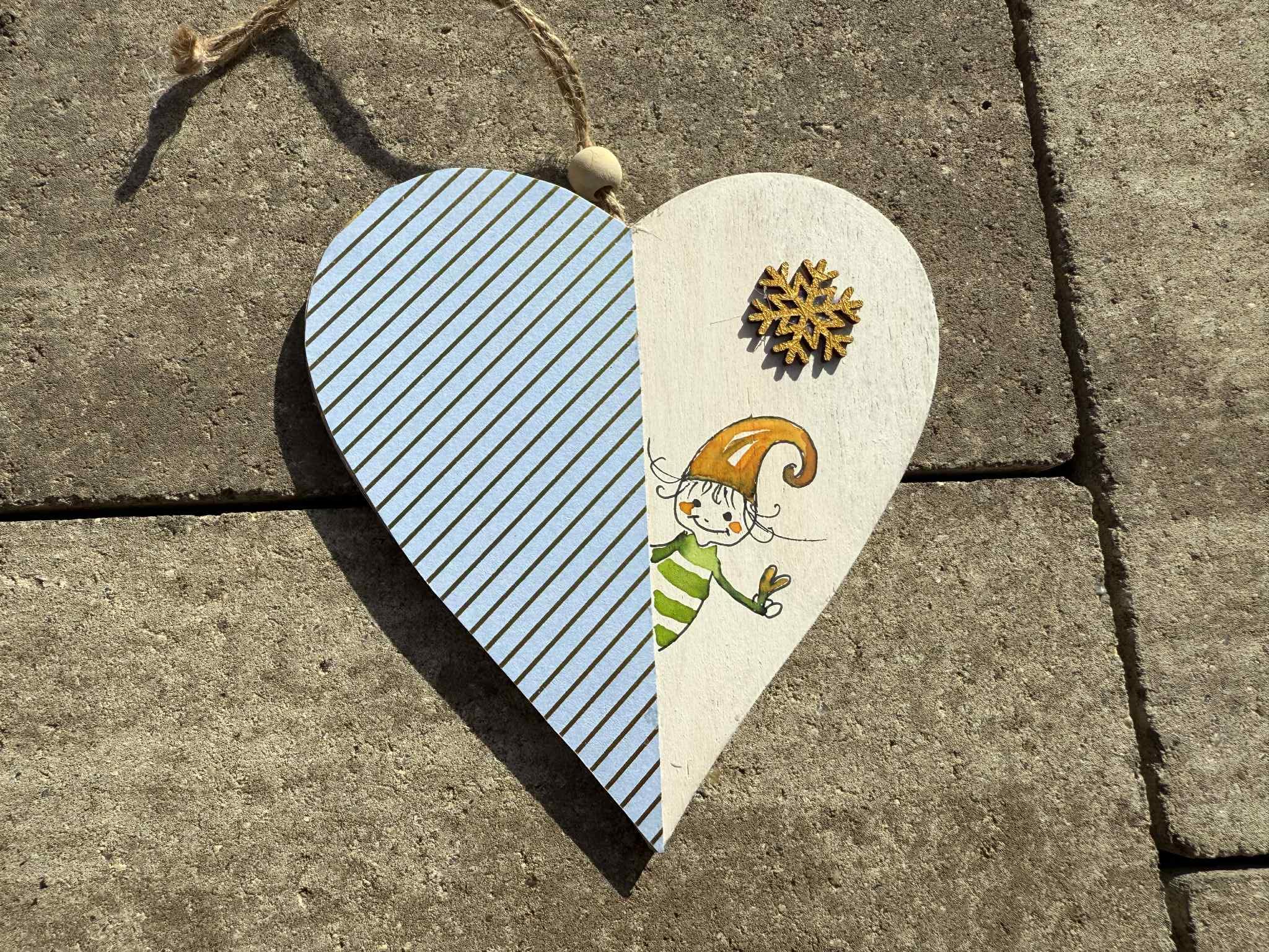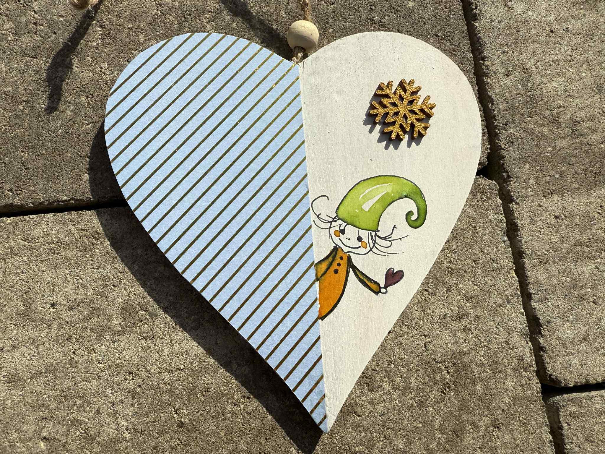 Szív alakú, bújós manós ajándékkísérő. Kézzel festett, egyedi termék. Felakasztható. Mérete: 12x12x0,4 cm