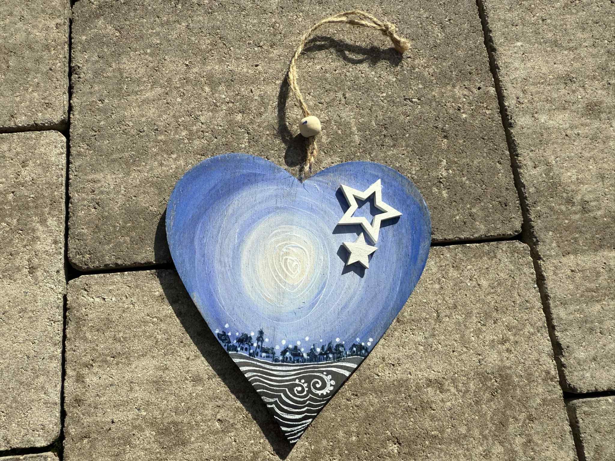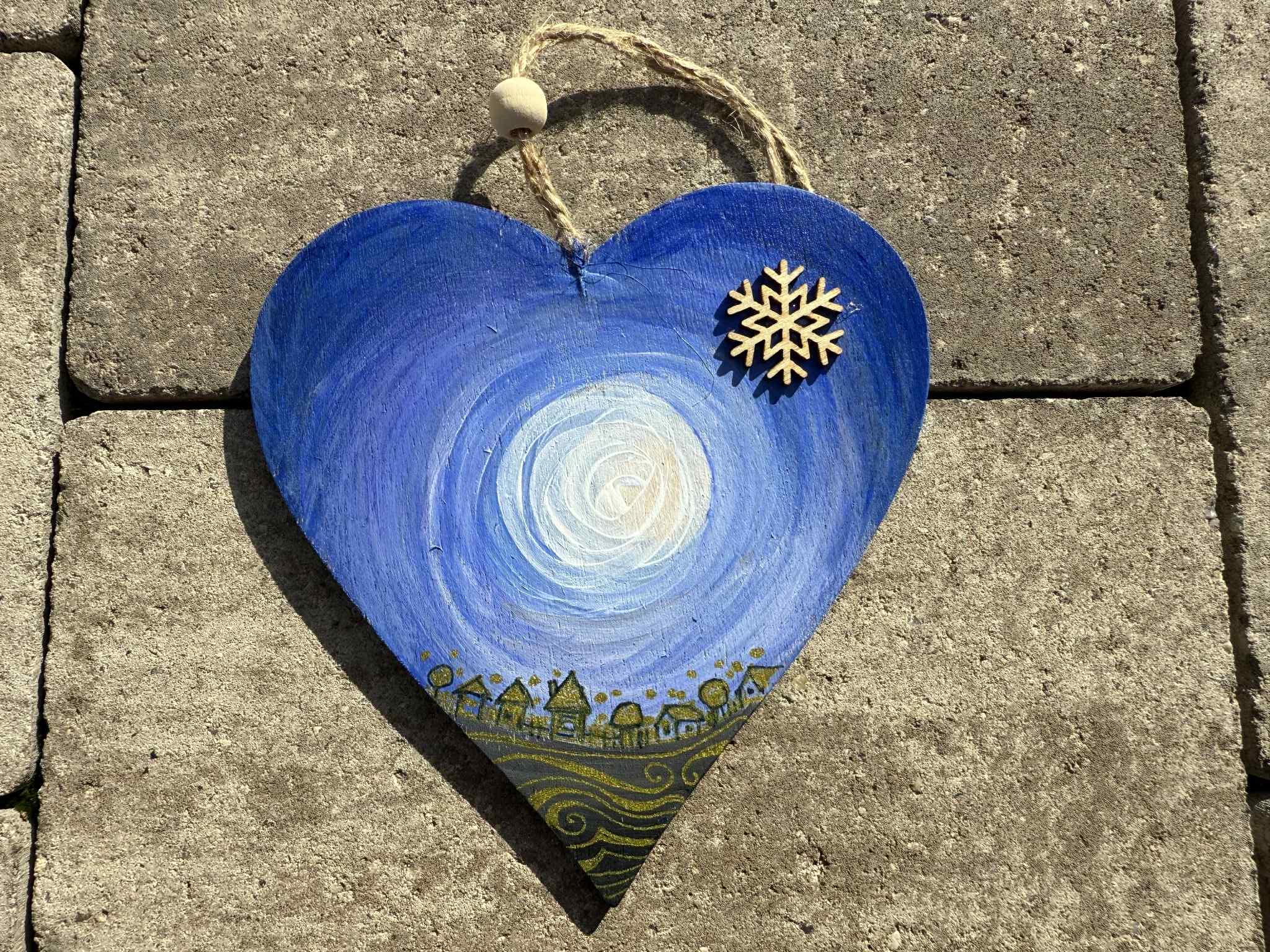 Szív alakú, csendes éj ajándékkísérő. Kézzel festett, egyedi termék. Felakasztható. Mérete: 12x12x0,4 cm