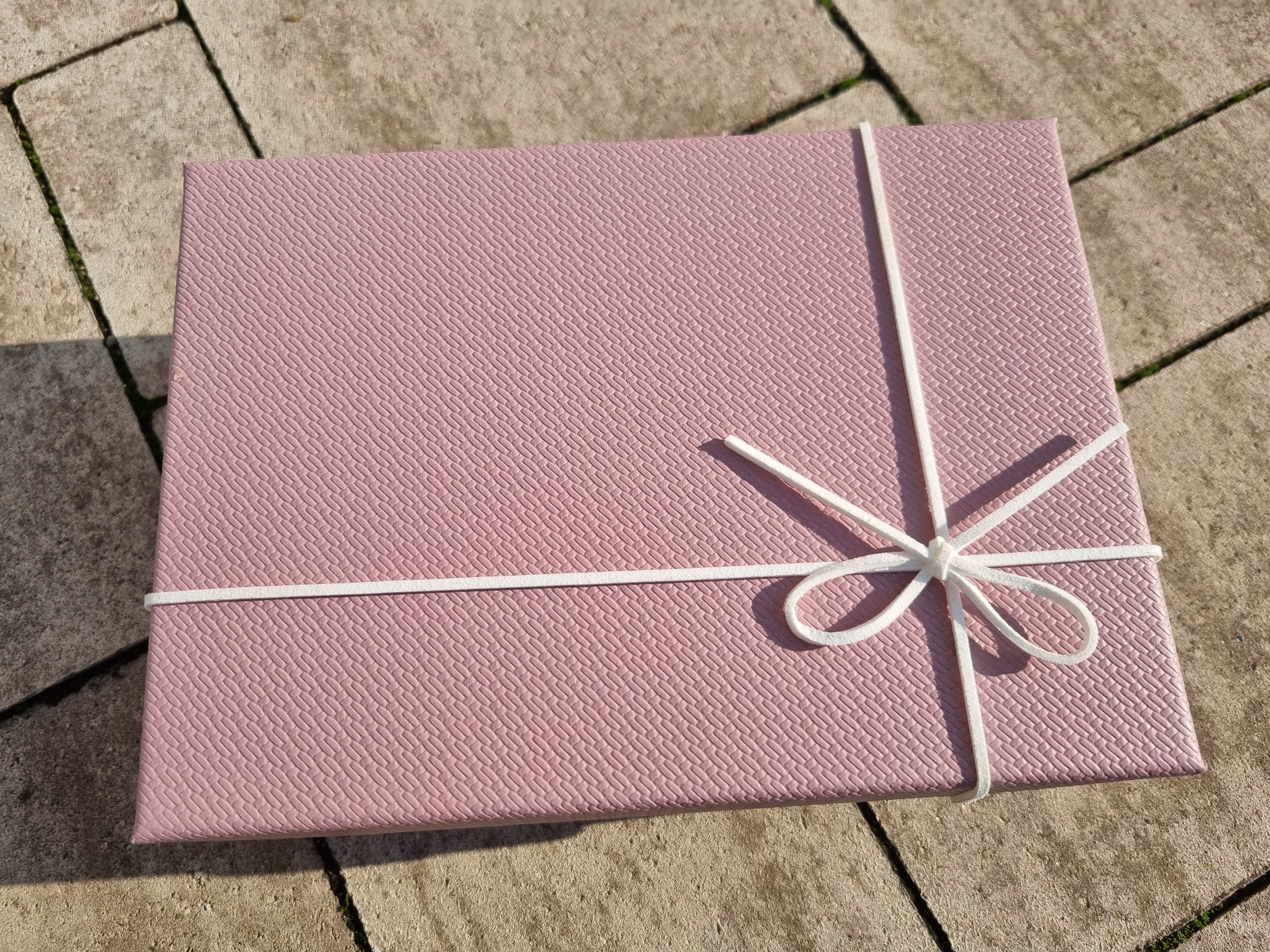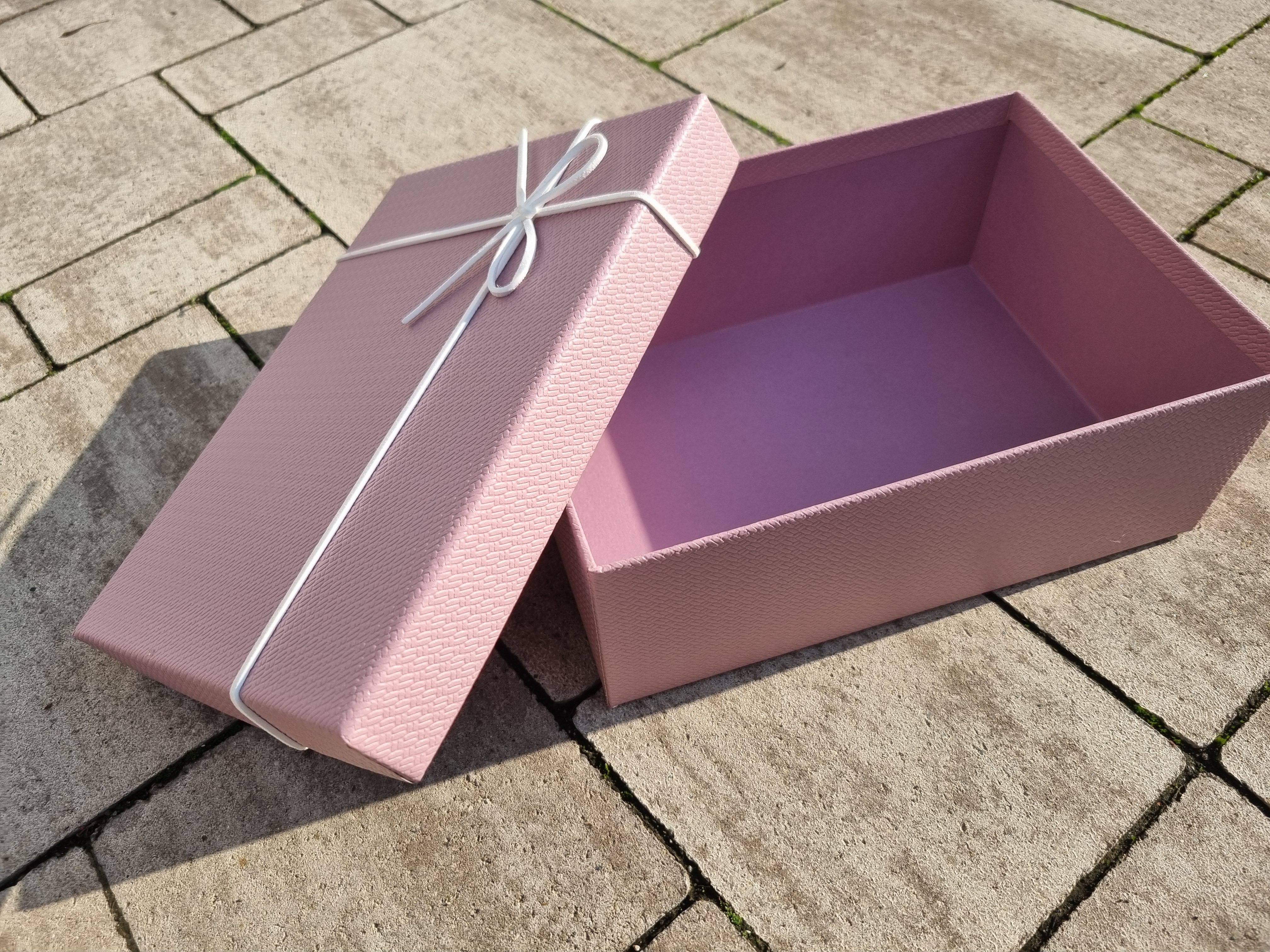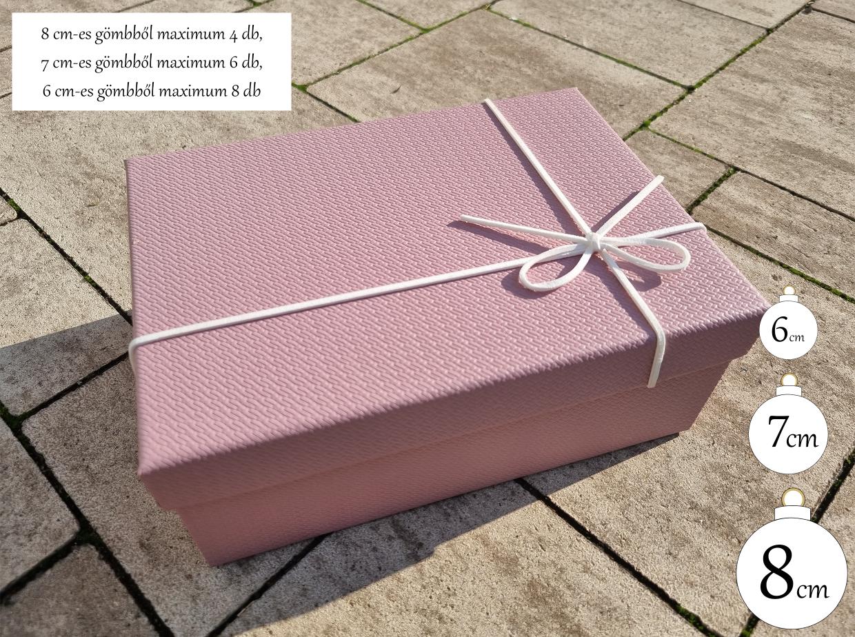 22x16x8,5 cm-es mályva színű díszdoboz, vékony fehér masnival átkötve. 8 cm-es üveggömbből maximum 4 db, 7 cm-es üveggömbből maximum 6 db, míg 6 cm-es üveggömből maximum 8 db fér bele.