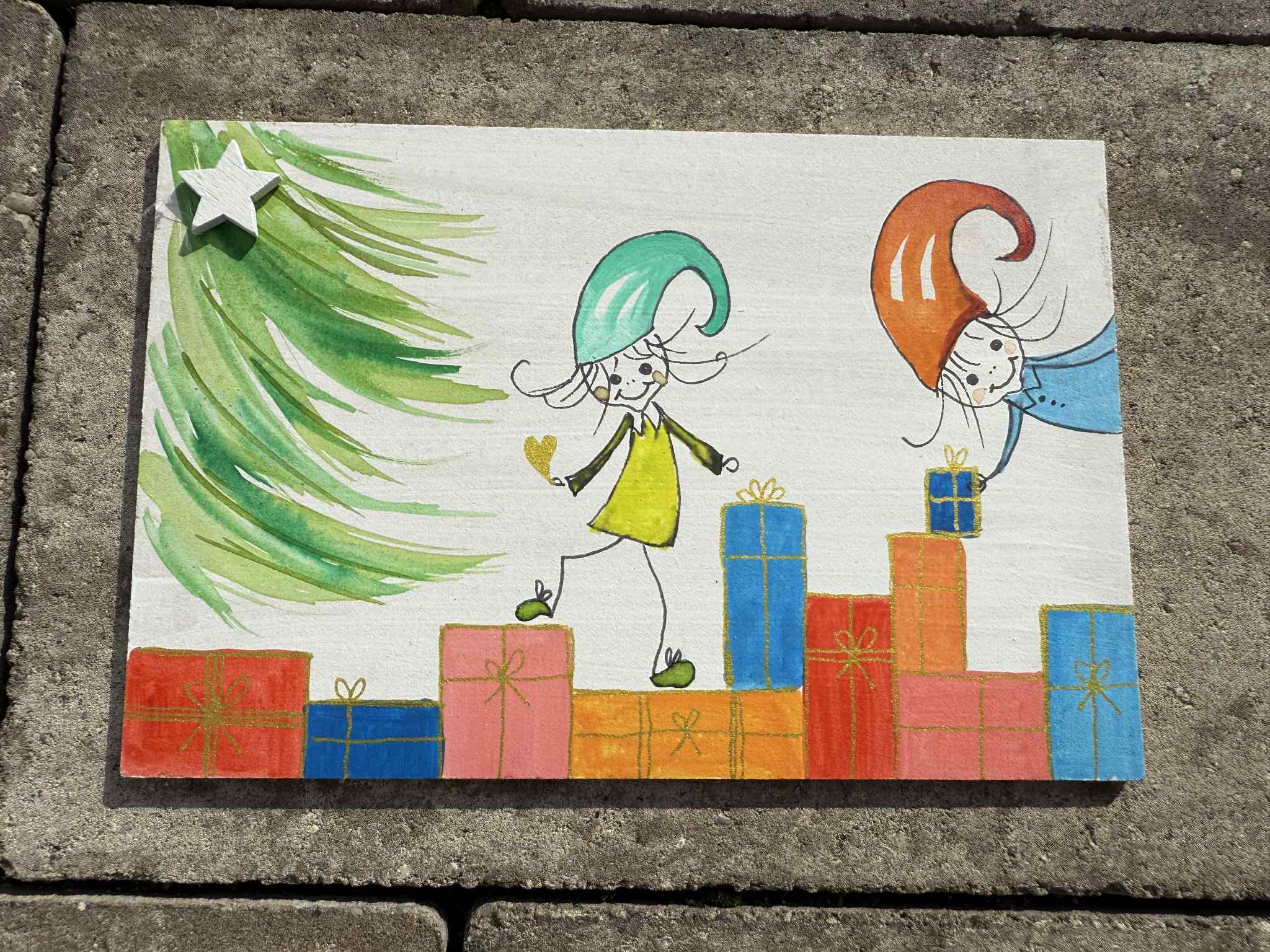 Téglalap alakú manós ajándékkísérő kártya. Kézzel festett, egyedi termék. Mérete: 15x10x0,3 cm