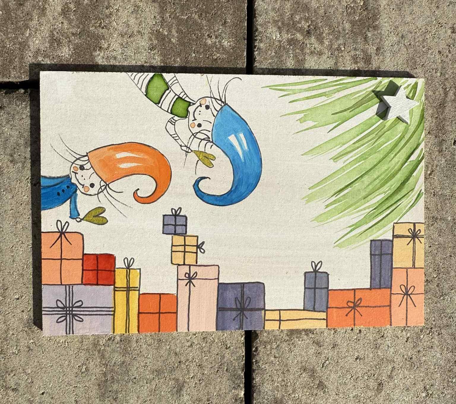 Téglalap alakú manós ajándékkísérő kártya. Kézzel festett, egyedi termék. Mérete: 15x10x0,3 cm
