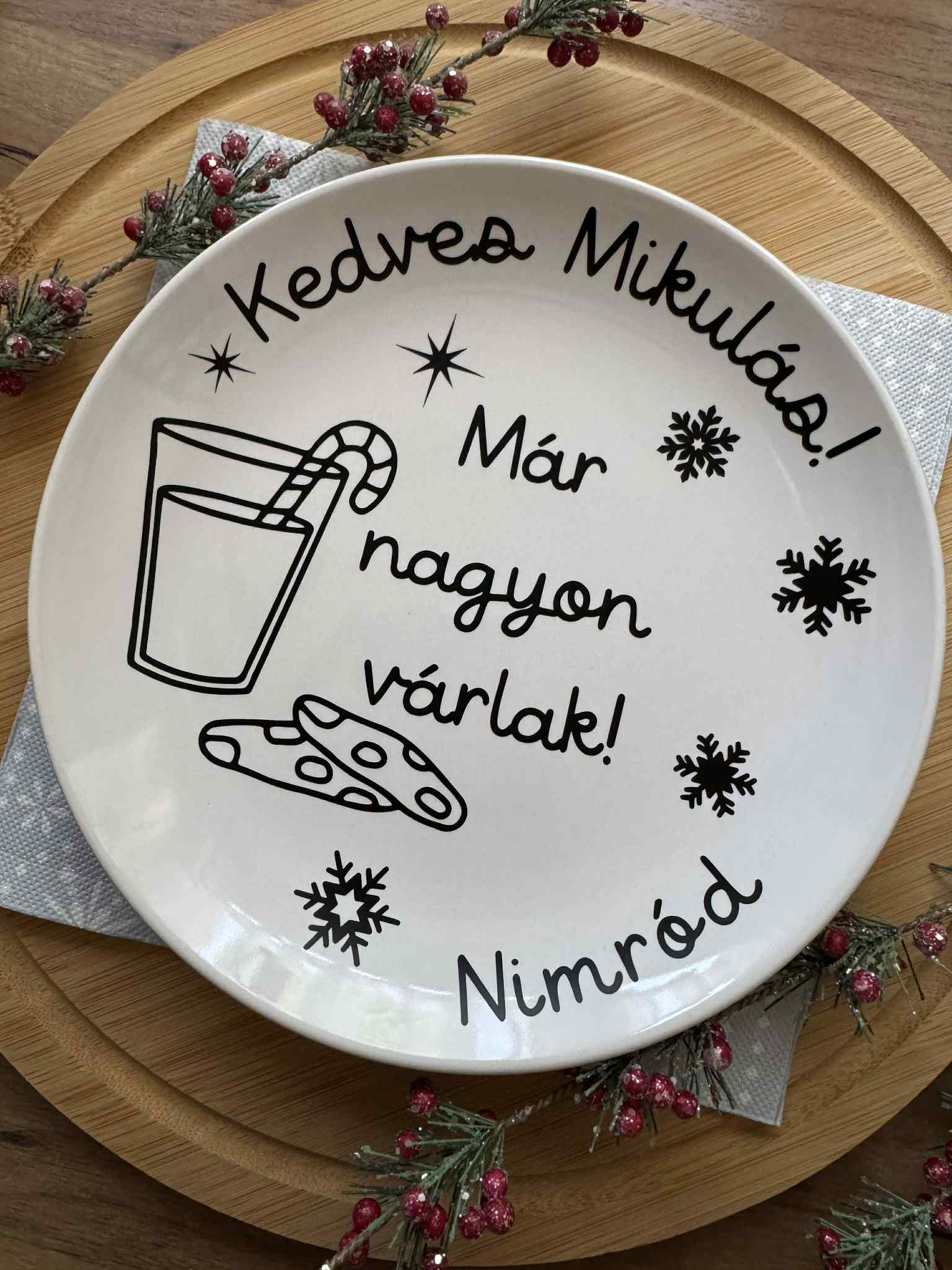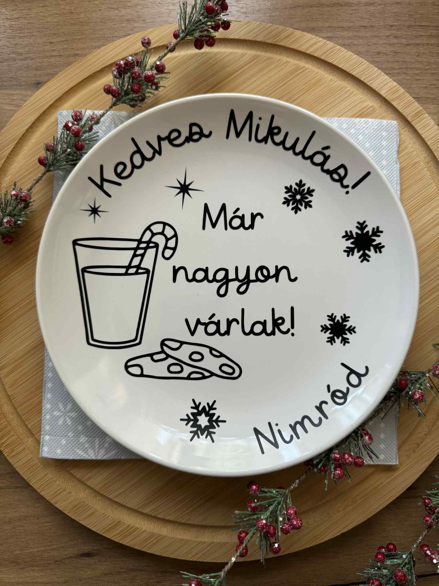Mikulás váró tányér! Kedves Mikulás! Tej, ha megszomjaznál… Süti, a hosszú útra… Répa, Rudolfnak… Ugye Ti is szoktatok egy kis csemegét kikészíteni Télapónak és Rudolfnak? Ha igen, akkor szükségetek lesz egy saját Mikulás tányérra. A tányér 20 cm átmérőjű (desszertes tányér méret). Fontos, hogy a tányér dekorációs célra készült, mosogatógépbe nem tehető, langyos vízzel tisztítható, hogy sokáig szép maradjon. Mivel névre szóló, így a vásárlás és fizetés után keress meg Minket e-mail-ben (Ez az e-mail-cím a szpemrobotok elleni védelem alatt áll. Megtekintéséhez engedélyeznie kell a JavaScript használatát.). Bármilyen kérdés esetén fordulj felénk bizalommal!