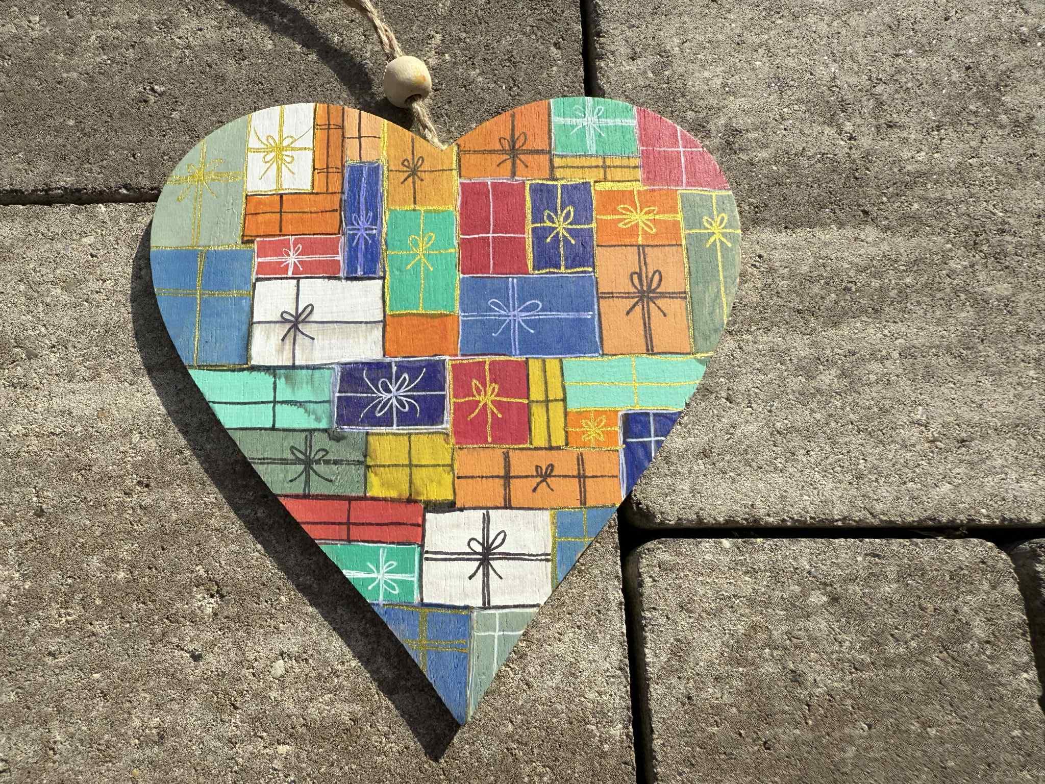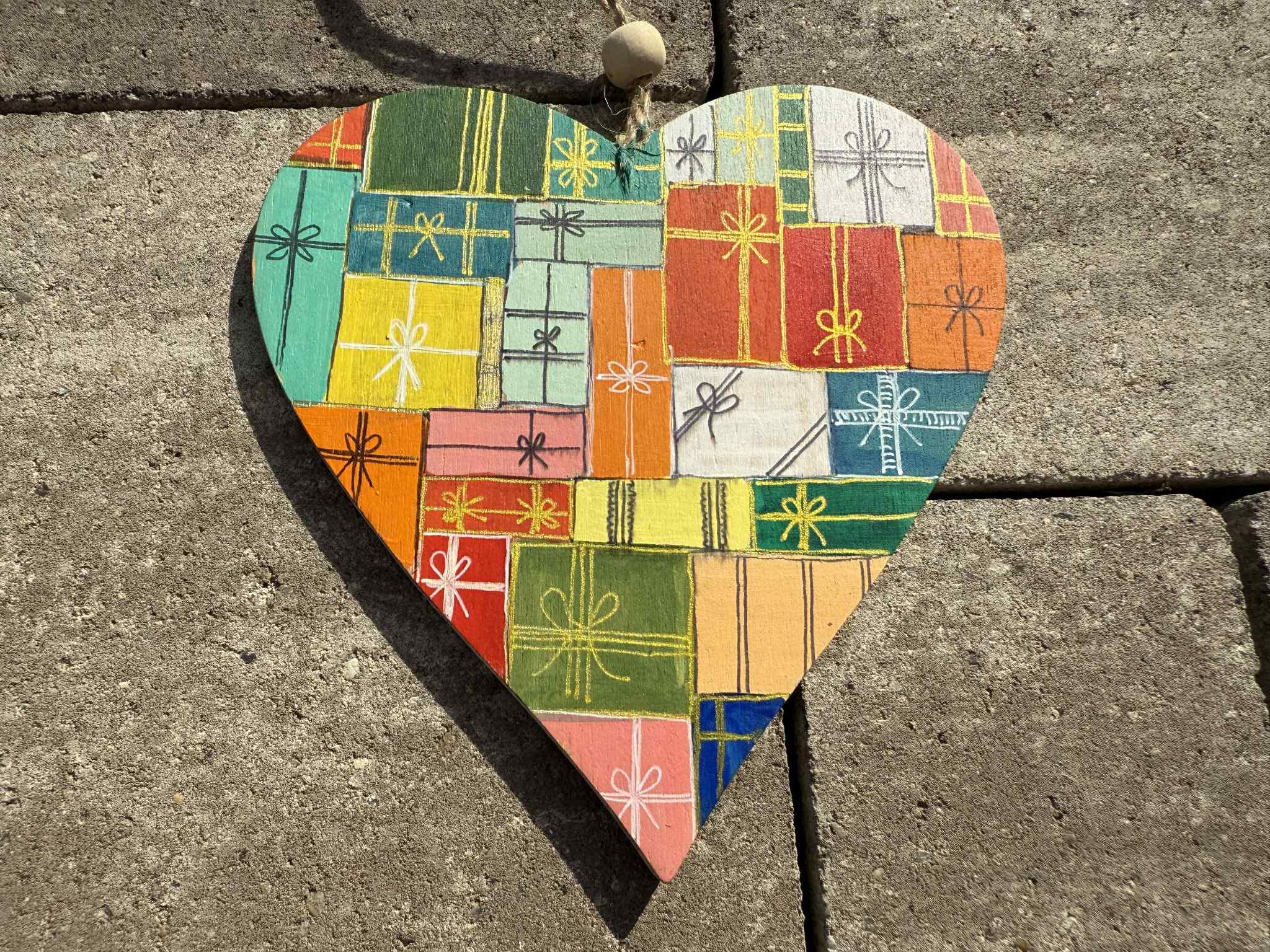 Szív alakú, karácsonyi dobozos ajándékkísérő. Kézzel festett, egyedi termék. Felakasztható. Mérete: 12x12x0,4 cm