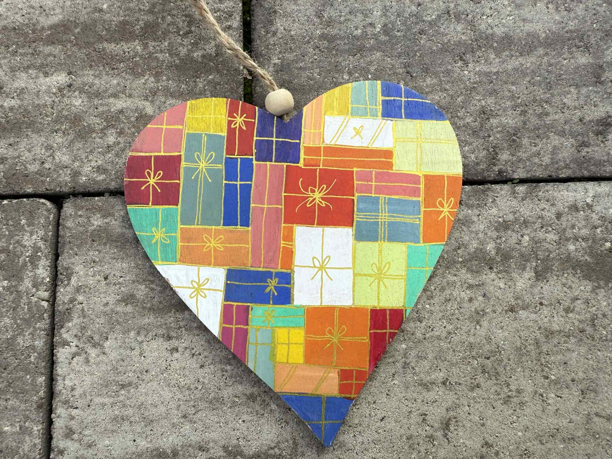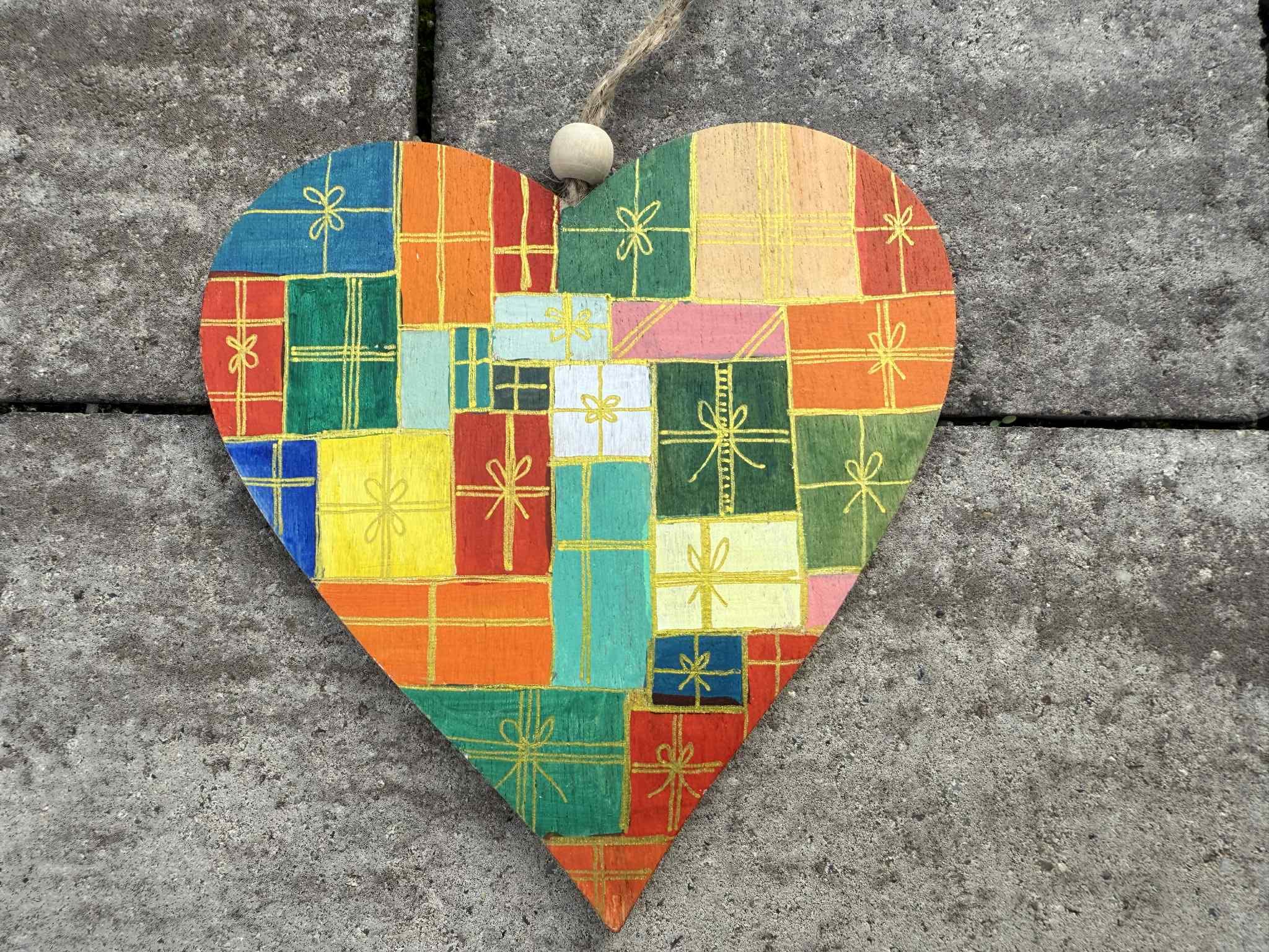 Szív alakú, karácsonyi dobozos ajándékkísérő. Kézzel festett, egyedi termék. Felakasztható. Mérete: 12x12x0,4 cm