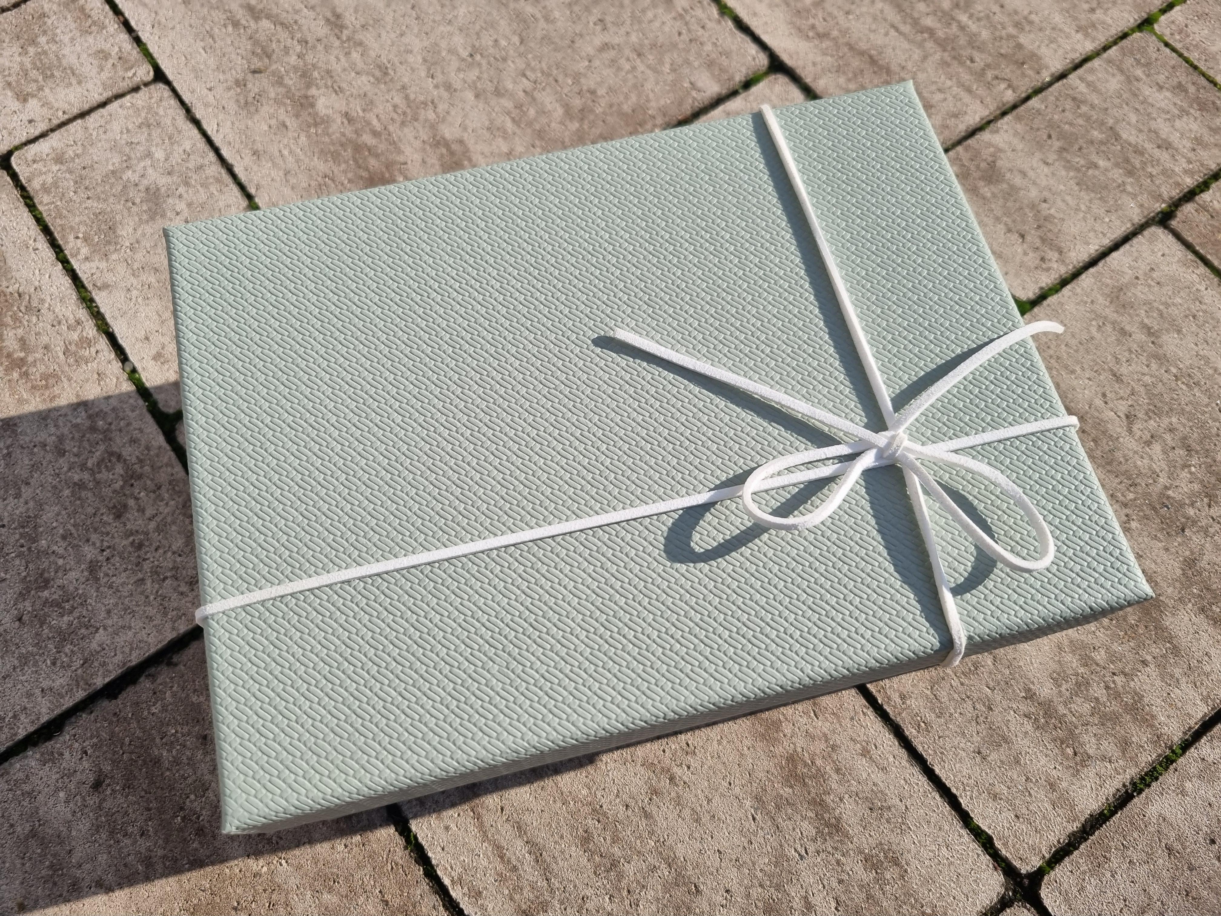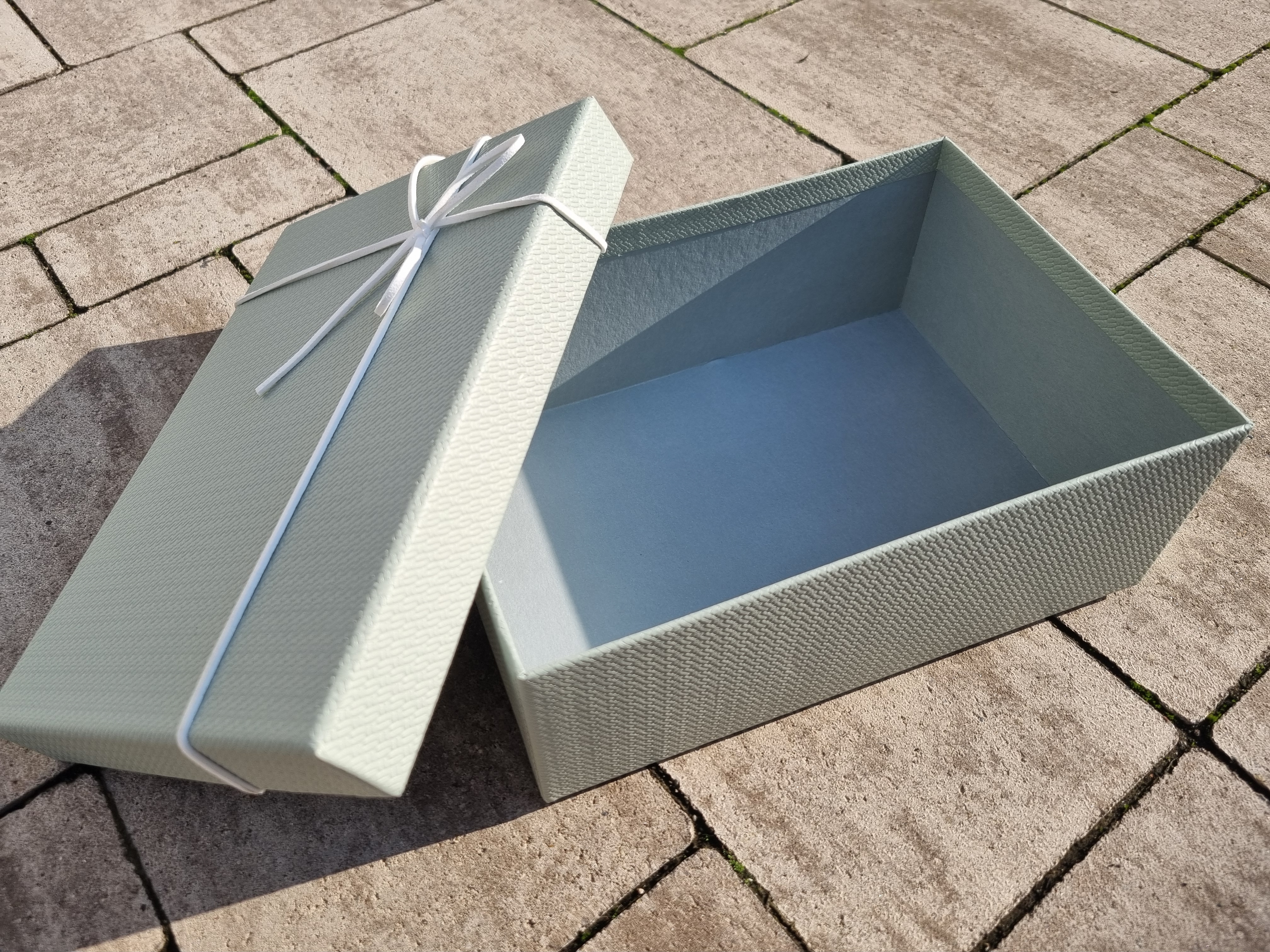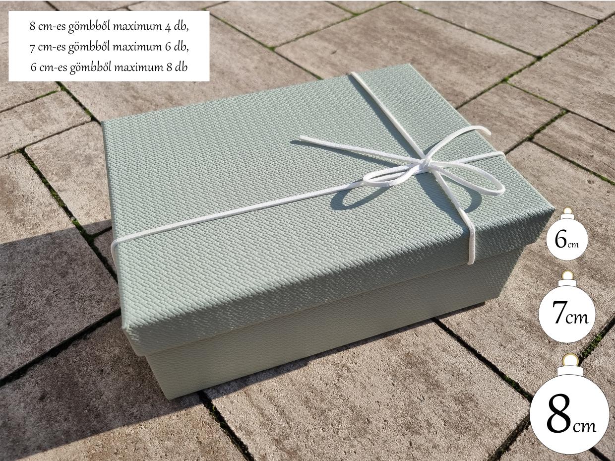22x16x8,5 cm-es zöld színű díszdoboz, vékony fehér masnival átkötve. 8 cm-es üveggömbből maximum 4 db, 7 cm-es üveggömbből maximum 6 db, míg 6 cm-es üveggömből maximum 8 db fér bele.